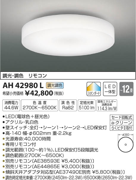 LED44.6W|¡üLED¡ÊÅŵ忧¡ÜÃë¸÷¿§¡Ë|¡ü¥¢¥¯¥ê¥ë¡¦ÆýÇò¿§|¡üÊÉ¥¹¥¤¥Ã¥Á¡§Á´Åô¢ª¥·¡¼¥ó1¢ª¥·¡¼¥ó2¢ªLEDÊݰÂÅô|¡É¡ü¹â-140 Éý-¦Õ602mm ½Å-2.2kg¡É|¡ü¾ÃÈñÅÅÎÏ:44.6W|¡ü¿§²¹ÅÙ:2700K¡Á6500K|¡ü±é¿§À:Ra82|¡É¡üÄê³Ê¸÷«:5¡¤100 lm¡É|¡É¡ü¸ÇÍ¥¨¥Í¥ë¥®¡¼¾ÃÈñ¸úΨ:114.3 lm/W¡É|¡É¡ü¸÷¸»¼÷Ì¿¡§40¡¤000»þ´Ö¡É|¡üÀìÍÑ¥ê¥â¥³¥óÉÕ|¡üÄ´¸÷ÈϰϡÊ100¡ÁÌó1¡ó¡Ë¡¢LEDÊݰÂÅô5Ãʳ¬Ä´¸÷|¡üÄ´¿§ÈϰϡÊ2700K¡Á6500K¡Ë|¡üÄ´¿§»þÄê³Ê¸÷«ÃÍ¡§2700K»þ¡Ê2450lm¡¦22.3W¡Ë/6500K»þ¡Ê2650lm¡¦22.3W¡Ë|¡É¡üÊÌÇä¥ê¥â¥³¥ó¡ÌAE38593E ¡ï5¡¤400¡ÊÀÇÈ´¡Ë¡Í¡É|¡É¡üÊÌÇä¥ê¥â¥³¥ó¡ÌAE44865E ¡ï3¡¤000¡ÊÀÇÈ´¡Ë¡Í¡É|¡É¡ü·¹¼ÐÅ·°æ¥¢¥À¥×¥¿Âбþ·¿¡ÌAE37490EÊÌÇä ¡ï5¡¤800¡ÊÀÇÈ´¡Ë¡Í¡É ¡Á12¾ö