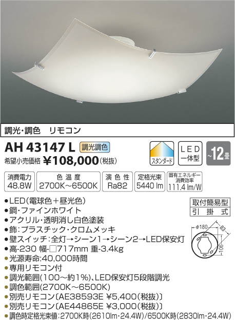 LED48.8W|¡üLED¡ÊÅŵ忧¡ÜÃë¸÷¿§¡Ë|¡ü¹Ý¡¦¥Õ¥¡¥¤¥ó¥Û¥ï¥¤¥È|¡ü¥¢¥¯¥ê¥ë¡¦Æ©ÌÀ¾Ã¤·Çò¿§ÅÉÁõ|¡ü¾þ¡§¥×¥é¥¹¥Á¥Ã¥¯¡¦¥¯¥í¥à¥á¥Ã¥|¡üÊÉ¥¹¥¤¥Ã¥Á¡§Á´Åô¢ª¥·¡¼¥ó1¢ª¥·¡¼¥ó2¢ªLEDÊݰÂÅô|¡É¡ü¹â-230 Éý-¢¢717mm ½Å-3.4kg¡É|¡ü¾ÃÈñÅÅÎÏ:48.8W|¡ü¿§²¹ÅÙ:2700K¡Á6500K|¡ü±é¿§À:Ra82|¡É¡üÄê³Ê¸÷«:5¡¤440 lm¡É|¡É¡ü¸ÇÍ¥¨¥Í¥ë¥®¡¼¾ÃÈñ¸úΨ:111.4 lm/W¡É|¡É¡ü¸÷¸»¼÷Ì¿¡§40¡¤000»þ´Ö¡É|¡üÀìÍÑ¥ê¥â¥³¥óÉÕ|¡üÄ´¸÷ÈϰϡÊ100¡ÁÌó1¡ó¡Ë¡¢LEDÊݰÂÅô5Ãʳ¬Ä´¸÷|¡üÄ´¿§ÈϰϡÊ2700K¡Á6500K¡Ë|¡É¡üÊÌÇä¥ê¥â¥³¥ó¡ÌAE38593E ¡ï5¡¤400¡ÊÀÇÈ´¡Ë¡Í¡É|¡É¡üÊÌÇä¥ê¥â¥³¥ó¡ÌAE44865E ¡ï3¡¤000¡ÊÀÇÈ´¡Ë¡Í¡É|¡üÄ´¿§»þÄê³Ê¸÷«ÃÍ¡§2700K»þ¡Ê2610lm¡¦24.4W¡Ë/6500K»þ¡Ê2830lm¡¦24.4W¡Ë ¡Á12¾ö