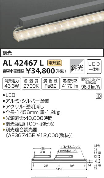 LED43.3W|¡üLED|¡ü¥¢¥ë¥ß¡¦¥·¥ë¥Ð¡¼ÅÉÁõ|¡ü¥¢¥¯¥ê¥ë¡¦Æ©ÌÀ¾Ã¤·|¡É¡ü¹â-40 Éý-28 Á´Ä¹-1456mm ½Å-1.2kg¡É|¡ü¾ÃÈñÅÅÎÏ:43.3W|¡ü¿§²¹ÅÙ:2700K|¡ü±é¿§À:Ra82|¡É¡üÄê³Ê¸÷«:4¡¤170 lm¡É|¡É¡ü¸ÇÍ¥¨¥Í¥ë¥®¡¼¾ÃÈñ¸úΨ:96.3 lm/W¡É|¡É¡ü¸÷¸»¼÷Ì¿¡§40¡¤000»þ´Ö¡É|¡üÄ´¸÷ÈϰϡÊ100¡ÁÌó5¡ó¡Ë|¡É¡üÊÌÇäŬ¹çÄ´¸÷´ï¡ÌAE36745E ¡ï12¡¤000¡ÊÀÇÈ´¡Ë¡Í¡É