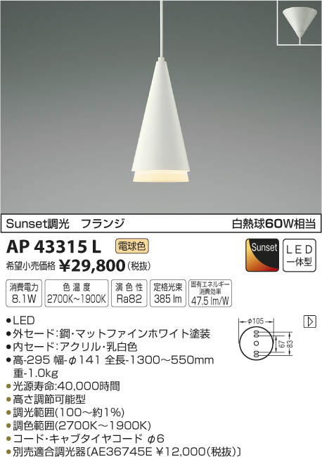 ¥³¥¤¥º¥ß¾ÈÌÀ KOIZUMI ¥Ú¥ó¥À¥ó¥È LED¡ÊÅŵ忧¡Ë AP43315L