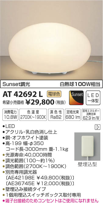 ÇòÇ®µå100WÁêÅö|¡üLED|¡ü¥¢¥¯¥ê¥ë¡¦ÆýÇò¿§¾Ã¤·»Å¾å|¡ü¹Ý¡¦¥ª¥Õ¥Û¥ï¥¤¥ÈÅÉÁõ|¡É¡ü¹â-199 Éý-¦Õ350 ¥³¡¼¥ÉĹ-3000mm ½Å-1.1kg¡É|¡ü¾ÃÈñÅÅÎÏ:10.8W|¡ü¿§²¹ÅÙ:2700K¡Á1900K|¡ü±é¿§À:Ra82|¡É¡üÄê³Ê¸÷«:680 lm¡É|¡É¡ü¸ÇÍ¥¨¥Í¥ë¥®¡¼¾ÃÈñ¸úΨ:62.9 lm/W¡É|¡É¡ü¸÷¸»¼÷Ì¿¡§40¡¤000»þ´Ö¡É|¡üÄ´¸÷ÈϰϡÊ100¡ÁÌó1¡ó¡Ë|¡üÄ´¿§ÈϰϡÊ2700K¡Á1900K¡Ë|¡É¡üÊÌÇäÀìÍÑÄ´¸÷´ï¡ÌAE42198E ¡ï49¡¤800¡ÊÀÇÈ´¡Ë¡Í¡ÌAE36745E ¡ï12¡¤000¡ÊÀÇÈ´¡Ë¡Í¡É|¡üÊÉËä¹þ¤ßÀܳ¥¿¥¤¥×|¡ü1¸ÄÍÑËä¹þ¥¹¥¤¥Ã¥Á¥Ü¥Ã¥¯¥¹¼èÉÕÀìÍÑ|¡üü»ÒÂæÀܳ¤Î¤¿¤á¥³¥ó¥»¥ó¥È¤Ï¤´»ÈÍѤˤʤì¤Þ¤»¤ó
