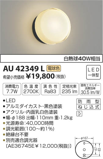 ÇòÇ®µå40WÁêÅö|¡üLED|¡ü¥¢¥ë¥ß¥À¥¤¥«¥¹¥È¡¦¹õ¿§ÅÉÁõ|¡ü¥¢¥¯¥ê¥ë¡¦ÆâÌÌÆýÇò¿§ÅÉÁõ|¡É¡üÉý-¦Õ188 ½ÐÉý-110mm ½Å-1.2kg¡É|¡ü¾ÃÈñÅÅÎÏ:7.7W|¡ü¿§²¹ÅÙ:2700K|¡ü±é¿§À:Ra83|¡É¡üÄê³Ê¸÷«:235 lm¡É|¡É¡ü¸ÇÍ¥¨¥Í¥ë¥®¡¼¾ÃÈñ¸úΨ:30.5 lm/W¡É|¡É¡ü¸÷¸»¼÷Ì¿¡§40¡¤000»þ´Ö¡É|¡üÄ´¸÷ÈϰϡÊ100¡ÁÌó1%¡Ë|¡üÀä±ïÂæÉÔÍ×|¡É¡üÊÌÇäŬ¹çÄ´¸÷´ï¡ÌAE36745E ¡ï12¡¤000¡ÊÀÇÈ´¡Ë¡Í¡É