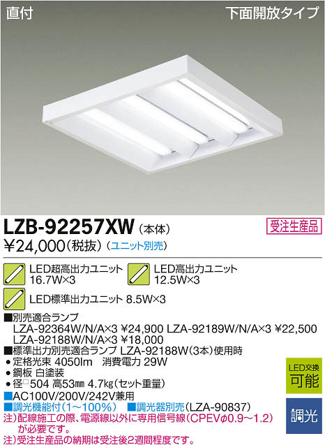 ¢£ÊÌÇäŬ¹ç¥é¥ó¥×LZA-92364W/N/A¡ß3 ¡ï24¡¤900 LZA-92189W/N/A¡ß3 ¡ï22¡¤500 LZA-92188W/N/A¡ß3 ¡ï18¡¤000|¢£AC100V/200V/242V·óÍÑ|¢£Ä´¸÷µ¡Ç½ÉÕ¡Ê1¡Á100%¡Ë|¢£Ä´¸÷´ïÊÌÇä¡ÊLZA-90837¡Ë|Ãí¡ËÇÛÀþ»Ü¹©¤ÎºÝ¡¢ÅŸ»Àþ°Ê³°¤ËÀìÍÑ¿®¹æÀþ¡ÊCPEV¦Õ0.9¡Á1.2¡Ë¤¬É¬ÍפǤ¹¡£|Ãí¡Ë¼õÃíÀ¸»ºÉʤÎǼ´ü¤Ï¼õÃí¸å£²½µ´ÖÄøÅ٤Ǥ¹¡£|¢£É¸½à½ÐÎÏÊÌÇäŬ¹ç¥é¥ó¥× LZA-92188W¡Ê3Ëܡ˻ÈÍÑ»þ Äê³Ê¸÷« 4050lm¡¡¾ÃÈñÅÅÎÏ 2