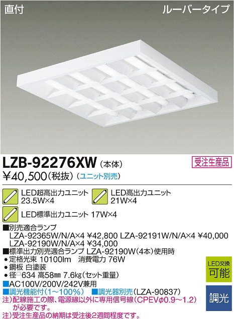 ¢£ÊÌÇäŬ¹ç¥é¥ó¥×LZA-92365W/N/A¡ß4 ¡ï42¡¤800 LZA-92191W/N/A¡ß4 ¡ï40¡¤000 LZA-92190W/N/A¡ß4 ¡ï34¡¤000|¢£AC100V/200V/242V·óÍÑ|¢£Ä´¸÷µ¡Ç½ÉÕ¡Ê1¡Á100%¡Ë|¢£Ä´¸÷´ïÊÌÇä¡ÊLZA-90837¡Ë|Ãí¡ËÇÛÀþ»Ü¹©¤ÎºÝ¡¢ÅŸ»Àþ°Ê³°¤ËÀìÍÑ¿®¹æÀþ¡ÊCPEV¦Õ0.9¡Á1.2¡Ë¤¬É¬ÍפǤ¹¡£|Ãí¡Ë¼õÃíÀ¸»ºÉʤÎǼ´ü¤Ï¼õÃí¸å£²½µ´ÖÄøÅ٤Ǥ¹¡£|¢£É¸½à½ÐÎÏÊÌÇäŬ¹ç¥é¥ó¥× LZA-92190W¡Ê4Ëܡ˻ÈÍÑ»þ Äê³Ê¸÷« 10100lm¡¡¾ÃÈñÅÅÎÏ