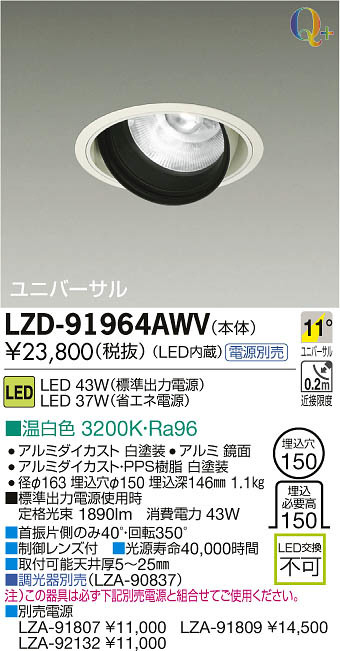 ¢£¼ó¿¶ÊÒ¦¤Î¤ß40¡ë¡¦²óž350¡ë|¢£À©¸æ¥ì¥ó¥ºÉÕ|¢£¸÷¸»¼÷Ì¿40¡¤000»þ´Ö|¢£¼èÉÕ²Äǽŷ°æ¸ü5¡Á25mm|¢£Ä´¸÷´ïÊÌÇä¡ÊLZA-90837¡Ë|Ãí¡Ë¤³¤Î´ï¶ñ¤Ïɬ¤º²¼µÊÌÇäÅŸ»¤ÈÁȹ礻¤Æ¤´»ÈÍѤ¯¤À¤µ¤¤¡£|¢£ÊÌÇäÅŸ»¡¡LZA-91807 ¡ï11¡¤000 LZA-91809 ¡ï14¡¤500 LZA-92132 ¡ï11¡¤000|¢£É¸½à½ÐÎÏÅŸ»»ÈÍÑ»þ¡¡Äê³Ê¸÷« 1890lm¡¡¾ÃÈñÅÅÎÏ 43W|Ra96