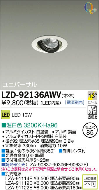 ¢£¼ó¿¶ÊÒ¦¤Î¤ß35¡ë¡¦²óž350¡ë|¢£À©¸æ¥ì¥ó¥ºÉÕ|¢£¸÷¸»¼÷Ì¿40¡¤000»þ´Ö|¢£¼èÉÕ²Äǽŷ°æ¸ü5¡Á25mm|¢£Ä´¸÷´ïÊÌÇä¡ÊLZA-90837¡¦90306E¡¦90637E¡Ë|Ãí¡Ë¤³¤Î´ï¶ñ¤Ïɬ¤º²¼µÊÌÇäÅŸ»¤ÈÁȹ礻¤Æ¤´»ÈÍѤ¯¤À¤µ¤¤¡£|¢£ÊÌÇäÅŸ»¡¡LZA-91114E ¡ï3¡¤500 Ëä¹þɬÍ×¹â90mm LZA-91119E ¡ï6¡¤000 Ëä¹þɬÍ×¹â90mm LZA-91122E ¡ï8¡¤000 Ëä¹þɬÍ×¹â180mm|Äê³Ê¸÷« 330lm¡¡¾ÃÈñÅÅÎÏ 10W|Ra96