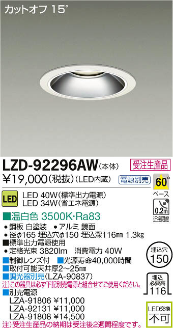 ¢£À©¸æ¥ì¥ó¥ºÉÕ|¢£¸÷¸»¼÷Ì¿40¡¤000»þ´Ö|¢£¼èÉÕ²Äǽŷ°æ¸ü2¡Á25mm|¢£Ä´¸÷´ïÊÌÇä¡ÊLZA-90837¡Ë|Ãí¡Ë¤³¤Î´ï¶ñ¤Ïɬ¤º²¼µÊÌÇäÅŸ»¤ÈÁȹ礻¤Æ¤´»ÈÍѤ¯¤À¤µ¤¤¡£|¢£ÊÌÇäÅŸ»¡¡LZA-91806 ¡ï11¡¤000 LZA-91808 ¡ï14¡¤500 LZA-92131 ¡ï11¡¤000|Ãí¡Ë¼õÃíÀ¸»ºÉʤÎǼ´ü¤Ï¼õÃí¸å£²½µ´ÖÄøÅ٤Ǥ¹¡£|¢£É¸½à½ÐÎÏÅŸ»»ÈÍÑ»þ¡¡Äê³Ê¸÷« 3820lm¡¡¾ÃÈñÅÅÎÏ 40W|Ra83