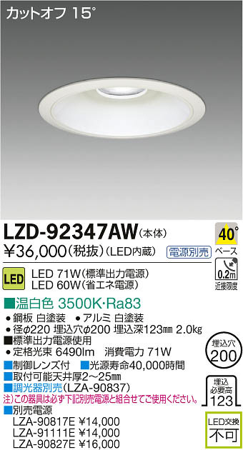 ¢£À©¸æ¥ì¥ó¥ºÉÕ|¢£¸÷¸»¼÷Ì¿40¡¤000»þ´Ö|¢£¼èÉÕ²Äǽŷ°æ¸ü2¡Á25mm|¢£Ä´¸÷´ïÊÌÇä¡ÊLZA-90837¡Ë|Ãí¡Ë¤³¤Î´ï¶ñ¤Ïɬ¤º²¼µÊÌÇäÅŸ»¤ÈÁȹ礻¤Æ¤´»ÈÍѤ¯¤À¤µ¤¤¡£|¢£ÊÌÇäÅŸ»¡¡LZA-90817E ¡ï14¡¤000 LZA-91111E ¡ï14¡¤000 LZA-90827E ¡ï16¡¤000|¢£É¸½à½ÐÎÏÅŸ»»ÈÍÑ»þ¡¡Äê³Ê¸÷« 6490lm¡¡¾ÃÈñÅÅÎÏ 71W|Ra83