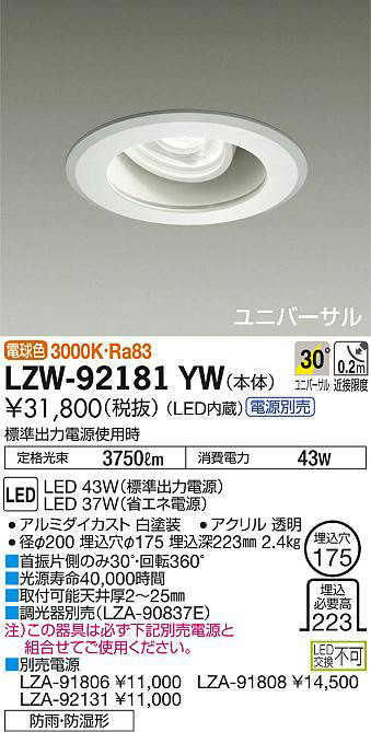 ¢£ÊÌÇäÅŸ»¡¡LZA-91806 ¡ï11¡¤000¡¡LZA-91808 ¡ï14¡¤500¡¡LZA-92131 ¡ï11¡¤000¡¢É¸½à½ÐÎÏÅŸ»»ÈÍÑ»þ¡¡Äê³Ê¸÷« 3750lm¡¡¾ÃÈñÅÅÎÏ 43W¡¢Ra83
