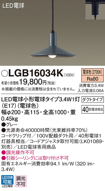 Panasonic LED ¥Ú¥ó¥À¥ó¥È¥é¥¤¥È LGB16034K