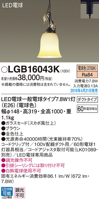 PANASONIC ¥Ñ¥Ê¥½¥Ë¥Ã¥¯ ¥Ú¥ó¥À¥ó¥È¥é¥¤¥È LGB16043K