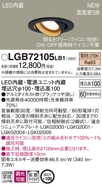 PANASONIC ¥Ñ¥Ê¥½¥Ë¥Ã¥¯ ¥À¥¦¥ó¥é¥¤¥È LGB72105LB1