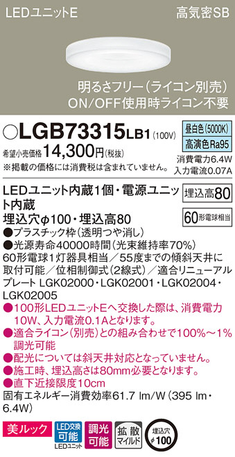 Panasonic ¥À¥¦¥ó¥é¥¤¥È LGB73315LB1