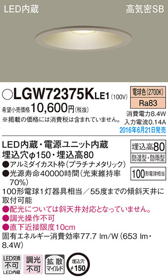 PANASONIC ¥Ñ¥Ê¥½¥Ë¥Ã¥¯ ¥Ð¥¹¥ë¡¼¥à¥é¥¤¥È LGW72375KLE1