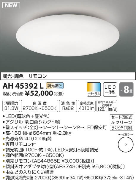 LED31.3W|¡üLED¡ÊÅŵ忧¡ÜÃë¸÷¿§¡Ë|¡ü¥¢¥¯¥ê¥ë¡¦ÆýÇò¿§¥·¥ë¥¯°õºþ|¡üÊÉ¥¹¥¤¥Ã¥Á¡§Á´Åô¢ª¥·¡¼¥ó1¢ª¥·¡¼¥ó2¢ªLEDÊݰÂÅô|¡É¡ü¹â-160 Éý-¦Õ664mm ½Å-2.3kg¡É|¡ü¾ÃÈñÅÅÎÏ:31.3W|¡ü¿§²¹ÅÙ:2700K¡Á6500K|¡ü±é¿§À:Ra82|¡É¡üÄê³Ê¸÷«:4¡¤010 lm¡É|¡É¡ü¸ÇÍ¥¨¥Í¥ë¥®¡¼¾ÃÈñ¸úΨ:128.1 lm/W¡É|¡É¡ü¸÷¸»¼÷Ì¿¡§40¡¤000»þ´Ö¡É|¡üÀìÍÑ¥ê¥â¥³¥óÉÕ|¡üÄ´¸÷ÈϰϡÊ100¡ÁÌó1¡ó¡Ë¡¢LEDÊݰÂÅô5Ãʳ¬Ä´¸÷|¡üÄ´¿§ÈϰϡÊ2700K¡Á6500K¡Ë|¡É¡üÊÌÇä¥ê¥â¥³¥ó¡ÌAE44865E ¡ï3¡¤000¡ÊÀÇÈ´¡Ë¡Í¡É|¡É¡ü·¹¼ÐÅ·°æ¥¢¥À¥×¥¿Âбþ·¿¡ÌAE37490EÊÌÇä ¡ï5¡¤800¡ÊÀÇÈ´¡Ë¡Í¡É|¡üÃî¤Ê¤É¤ÎÆþ¤ê¤Ë¤¯¤¤¹½Â¤|¡üÄ´¿§»þÄê³Ê¸÷«ÃÍ¡§2700K»þ¡Ê3690lm¡¦34.1W¡Ë/6500K»þ¡Ê3725lm¡¦31.4W¡Ë ¡Á8¾ö