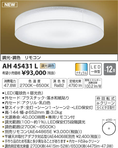 LED47.8W|¡üLED¡ÊÅŵ忧¡ÜÃë¸÷¿§¡Ë|¡ü³°¥»¡¼¥É¡§¥×¥é¥¹¥Á¥Ã¥¯¡¦Íî¿åÏ»æÅ½¤ê|¡üÆâ¥»¡¼¥É¡§¥¢¥¯¥ê¥ë¡¦ÆýÇò¿§|¡üÊÉ¥¹¥¤¥Ã¥Á¡§Á´Åô¢ª¥·¡¼¥ó1¢ª¥·¡¼¥ó2¢ªLEDÊݰÂÅô|¡É¡ü¹â-144 Éý-¦Õ652mm ½Å-3.0kg¡É|¡ü¾ÃÈñÅÅÎÏ:47.8W|¡ü¿§²¹ÅÙ:2700K¡Á6500K|¡ü±é¿§À:Ra82|¡É¡üÄê³Ê¸÷«:4¡¤790 lm¡É|¡É¡ü¸ÇÍ¥¨¥Í¥ë¥®¡¼¾ÃÈñ¸úΨ:100.2 lm/W¡É|¡É¡ü¸÷¸»¼÷Ì¿¡§40¡¤000»þ´Ö¡É|¡üÀìÍÑ¥ê¥â¥³¥óÉÕ|¡üÄ´¸÷ÈϰϡÊ100¡ÁÌó1¡ó¡Ë¡¢LEDÊݰÂÅô5Ãʳ¬Ä´¸÷|¡üÄ´¿§ÈϰϡÊ2700K¡Á6500K¡Ë|¡É¡üÊÌÇä¥ê¥â¥³¥ó¡ÌAE44865E ¡ï3¡¤000¡ÊÀÇÈ´¡Ë¡Í¡É|¡É¡ü´È±ïÅ·°æ¼èÉÕ¥¢¥À¥×¥¿Âбþ·¿¡ÌAE44068EÊÌÇä ¡ï2¡¤400¡ÊÀÇÈ´¡Ë¡Í¡É|¡É¡ü·¹¼ÐÅ·°æ¥¢¥À¥×¥¿Âбþ·¿¡ÌAE37490EÊÌÇä ¡ï5¡¤800¡ÊÀÇÈ´¡Ë¡Í¡É|¡ü¼êºî¤êÉʤΤ¿¤á¼Ì¿¿¤È¿¾¯°Û¤Ê¤ë¤³¤È¤¬¤¢¤ê¤Þ¤¹|¡üÆâ¥»¡¼¥É¤Î¤ßa-¥¯¥ê¡¼¥ó|¡üÄ´¿§»þÄê³Ê¸÷«ÃÍ¡§2700K»þ¡Ê4415lm¡¦52W¡Ë/6500K»þ¡Ê4475lm¡¦47.9W¡Ë ¡Á12¾ö