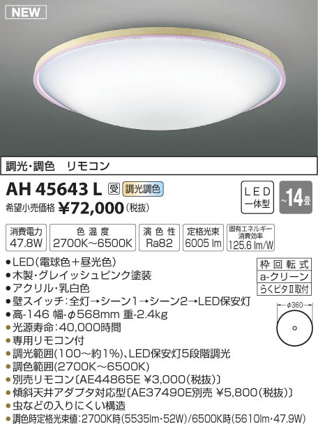 LED47.8W|¡üLED¡ÊÅŵ忧¡ÜÃë¸÷¿§¡Ë|¡üÌÚÀ½¡¦¥°¥ì¥¤¥Ã¥·¥å¥Ô¥ó¥¯|¡ü¥¢¥¯¥ê¥ë¡¦ÆýÇò¿§|¡üÊÉ¥¹¥¤¥Ã¥Á¡§Á´Åô¢ª¥·¡¼¥ó1¢ª¥·¡¼¥ó2¢ªLEDÊݰÂÅô|¡É¡ü¹â-146 Éý-¦Õ568mm ½Å-2.4kg¡É|¡ü¾ÃÈñÅÅÎÏ:47.8W|¡ü¿§²¹ÅÙ:2700K¡Á6500K|¡ü±é¿§À:Ra82|¡É¡üÄê³Ê¸÷«:6¡¤005 lm¡É|¡É¡ü¸ÇÍ¥¨¥Í¥ë¥®¡¼¾ÃÈñ¸úΨ:125.6 lm/W¡É|¡É¡ü¸÷¸»¼÷Ì¿¡§40¡¤000»þ´Ö¡É|¡üÀìÍÑ¥ê¥â¥³¥óÉÕ|¡üÄ´¸÷ÈϰϡÊ100¡ÁÌó1¡ó¡Ë¡¢LEDÊݰÂÅô5Ãʳ¬Ä´¸÷|¡üÄ´¿§ÈϰϡÊ2700K¡Á6500K¡Ë|¡É¡üÊÌÇä¥ê¥â¥³¥ó¡ÌAE44865E ¡ï3¡¤000¡ÊÀÇÈ´¡Ë¡Í¡É|¡É¡ü·¹¼ÐÅ·°æ¥¢¥À¥×¥¿Âбþ·¿¡ÌAE37490EÊÌÇä ¡ï5¡¤800¡ÊÀÇÈ´¡Ë¡Í¡É|¡üÃî¤Ê¤É¤ÎÆþ¤ê¤Ë¤¯¤¤¹½Â¤|¡üÄ´¿§»þÄê³Ê¸÷«ÃÍ¡§2700K»þ¡Ê5535lm¡¦52W¡Ë/6500K»þ¡Ê5610lm¡¦47.9W¡Ë ¡Á14¾ö