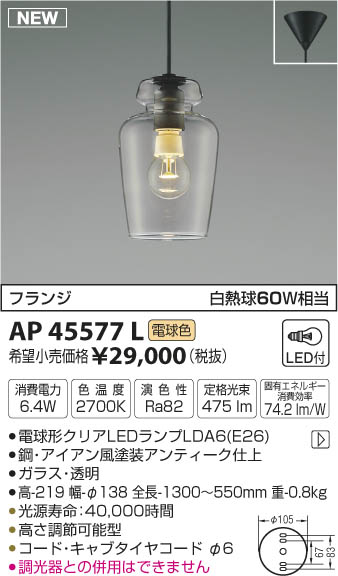 ¥³¥¤¥º¥ß¾ÈÌÀ KOIZUMI ¥Ú¥ó¥À¥ó¥È LED¡ÊÅŵ忧¡Ë AP45577L