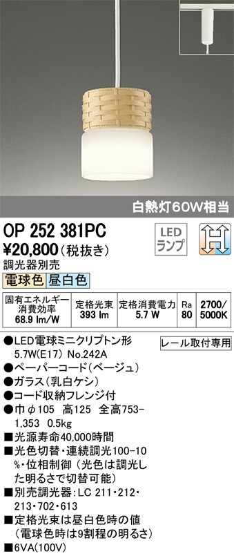 ODELIC ¥ª¡¼¥Ç¥ê¥Ã¥¯ ¥Ú¥ó¥À¥ó¥È¥é¥¤¥È OP252381PC