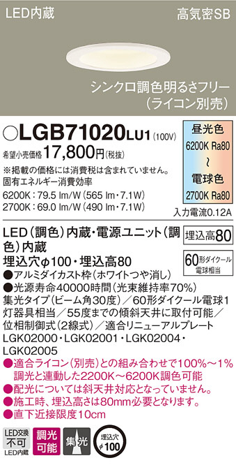 Panasonic ¥À¥¦¥ó¥é¥¤¥È LGB71020LU1
