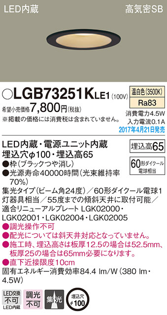 Panasonic LED ¥À¥¦¥ó¥é¥¤¥È LGB73251KLE1