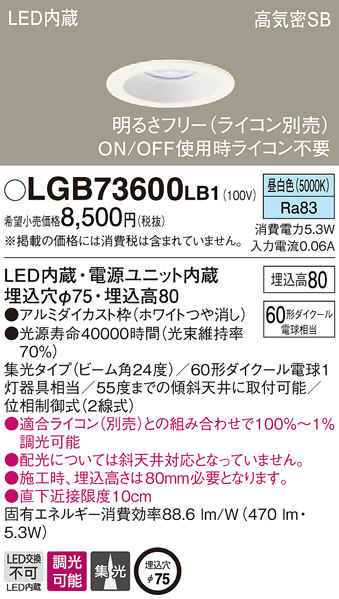 Panasonic ¥À¥¦¥ó¥é¥¤¥È LGB73600LB1