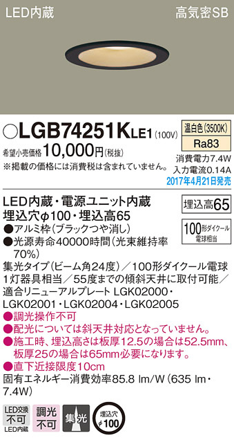 Panasonic LED ¥À¥¦¥ó¥é¥¤¥È LGB74251KLE1
