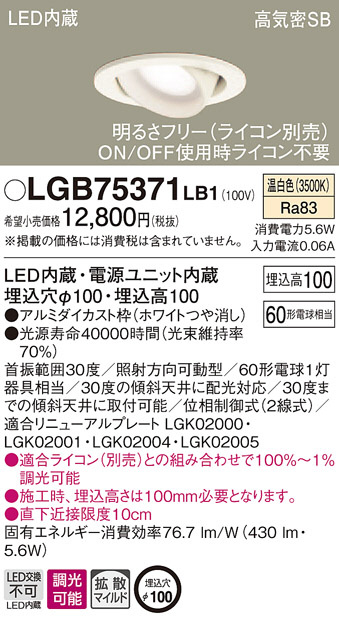 Panasonic ¥À¥¦¥ó¥é¥¤¥È LGB75371LB1
