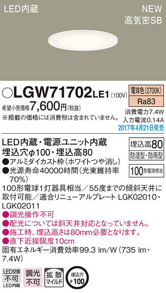 Panasonic LED ¥À¥¦¥ó¥é¥¤¥È LGW71702LE1