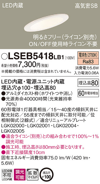Panasonic ¥À¥¦¥ó¥é¥¤¥È LSEB5418LB1