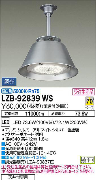 ¢£Ä´¸÷´ïÊÌÇä¡ÊLZA-90837E¡Ë¡¢Ãí¡Ë¼õÃíÀ¸»ºÉʤÎǼ´ü¤ÏÊÀ¼Ò±Ä¶È½ê¤Ø¤ªÌä¹ç¤»²¼¤µ¤¤¡£¡¢Ãí¡ËÇÛÀþ»Ü¹©¤ÎºÝ¡¢ÅŸ»Àþ°Ê³°¤ËÀìÍÑ¿®¹æÀþ¡ÊCPEV¦Õ0.9¡Á1.2¡Ë¤¬É¬ÍפǤ¹¡£¡¢Äê³Ê¸÷« 11000lm¡¡¾ÃÈñÅÅÎÏ 73.6W¡¢Ra75