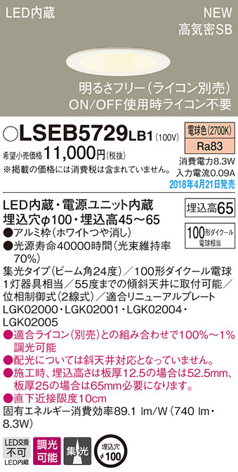 Panasonic ¥À¥¦¥ó¥é¥¤¥È LSEB5729LB1