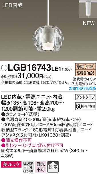 Panasonic LED ¥Ú¥ó¥À¥ó¥È¥é¥¤¥È LGB16743LE1