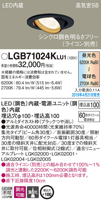 Panasonic LED ¥À¥¦¥ó¥é¥¤¥È LGB71024KLU1