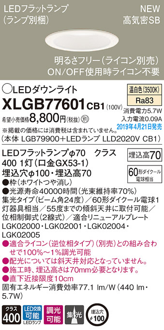 Panasonic LED ¥À¥¦¥ó¥é¥¤¥È XLGB77601CB1