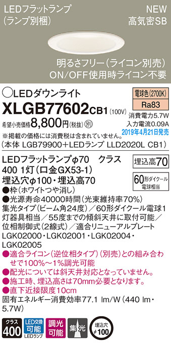 Panasonic LED ¥À¥¦¥ó¥é¥¤¥È XLGB77602CB1