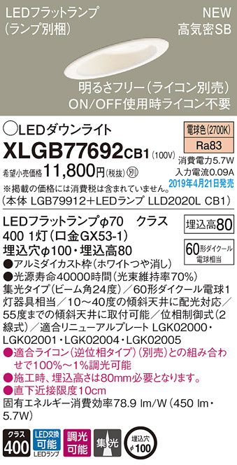 Panasonic LED ¥À¥¦¥ó¥é¥¤¥È XLGB77692CB1