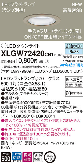 Panasonic LED ¥¨¥¯¥¹¥Æ¥ê¥¢¡¦¥¢¥¦¥È¥É¥¢ XLGW72420CB1