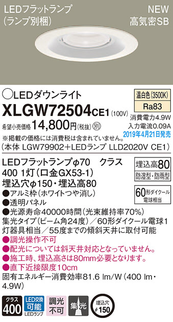 Panasonic LED ¥¨¥¯¥¹¥Æ¥ê¥¢¡¦¥¢¥¦¥È¥É¥¢ XLGW72504CE1
