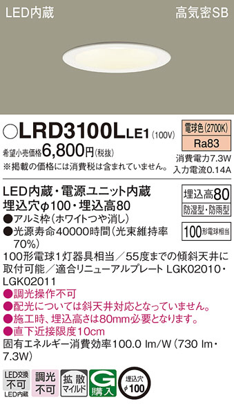 Panasonic ¥¨¥¯¥¹¥Æ¥ê¥¢¥À¥¦¥ó¥é¥¤¥È LRD3100LLE1