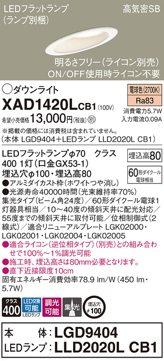 Panasonic ¥À¥¦¥ó¥é¥¤¥È XAD1420LCB1