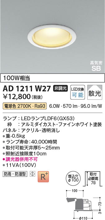 Koizumi ¥³¥¤¥º¥ß¾ÈÌÀ LED¹âµ¤Ì©SB¥À¥¦¥ó¥é¥¤¥È AD1211W27