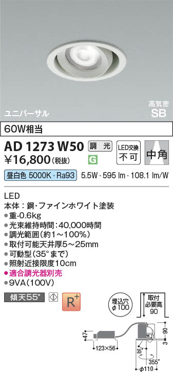 Koizumi ¥³¥¤¥º¥ß¾ÈÌÀ LED¹âµ¤Ì©SB¥æ¥Ë¥Ð¡¼¥µ¥ë¥À¥¦¥ó¥é¥¤¥È AD1273W50