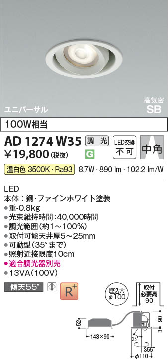 Koizumi ¥³¥¤¥º¥ß¾ÈÌÀ LED¹âµ¤Ì©SB¥æ¥Ë¥Ð¡¼¥µ¥ë¥À¥¦¥ó¥é¥¤¥È AD1274W35