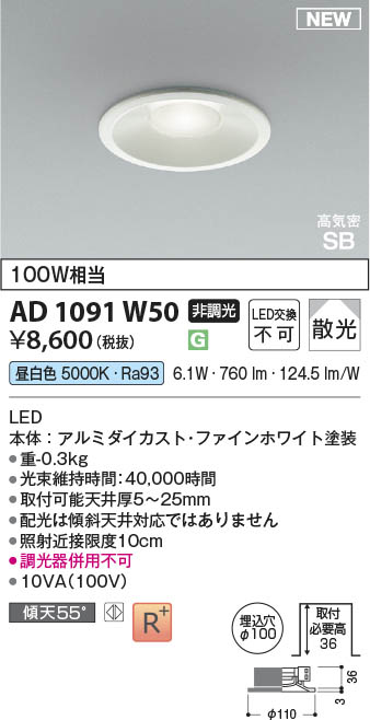 Koizumi ¥³¥¤¥º¥ß¾ÈÌÀ LED¹âµ¤Ì©SB¥À¥¦¥ó¥é¥¤¥È AD1091W50