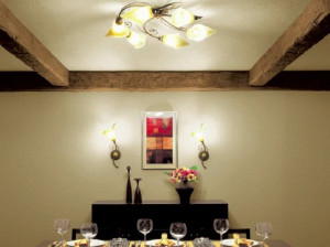 錆び塗装のアイアンにゴールドのアクセント付、イタリー製のアンバーガラスを使ったアンティーク系シャンデリア。18.5cmの薄さも人気の理由。