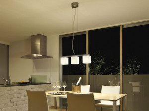 スクエアな乳白ガラス3連のワイヤー吊りペンダント。小型ペンダントの多灯使いもいいのですが、こういう納まり方もスッキリしっくりきます。