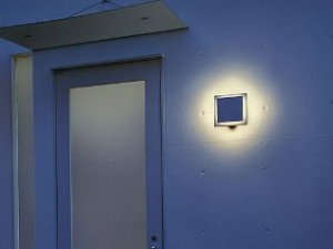 間接照明のような屋外用防雨型ブラケットライト。アルミダイカスト(シルバー塗装)の2枚の板による遮光。人感センサーの「目玉」が下部にぎょろり。