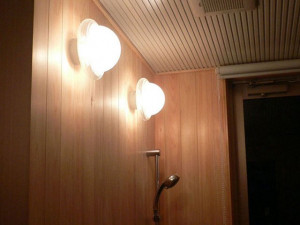お魚の目のようなバスライト。後ろに光がもれ、間接タイプになっているのもオススメ。ガラス素材で清潔感のある器具。電球形蛍光灯も使えます。